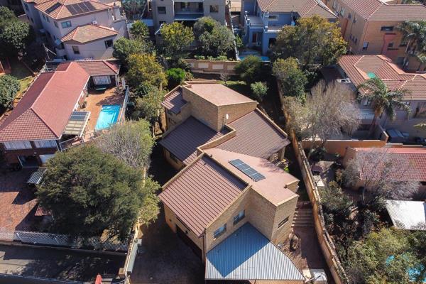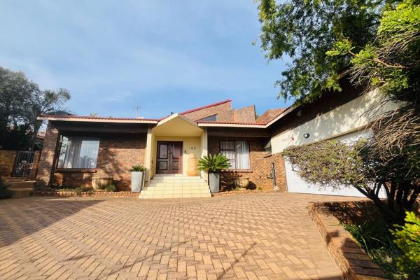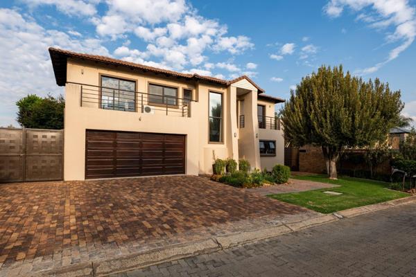 Downstairs features and inviting entrance hall, guest toilet and a generous open plan dining area flowing into two lounges. The living area flows onto an undercover patio with a built-in braai overlooking a well-maintained garden, creating an ideal indoor/outdoor lifestyle.